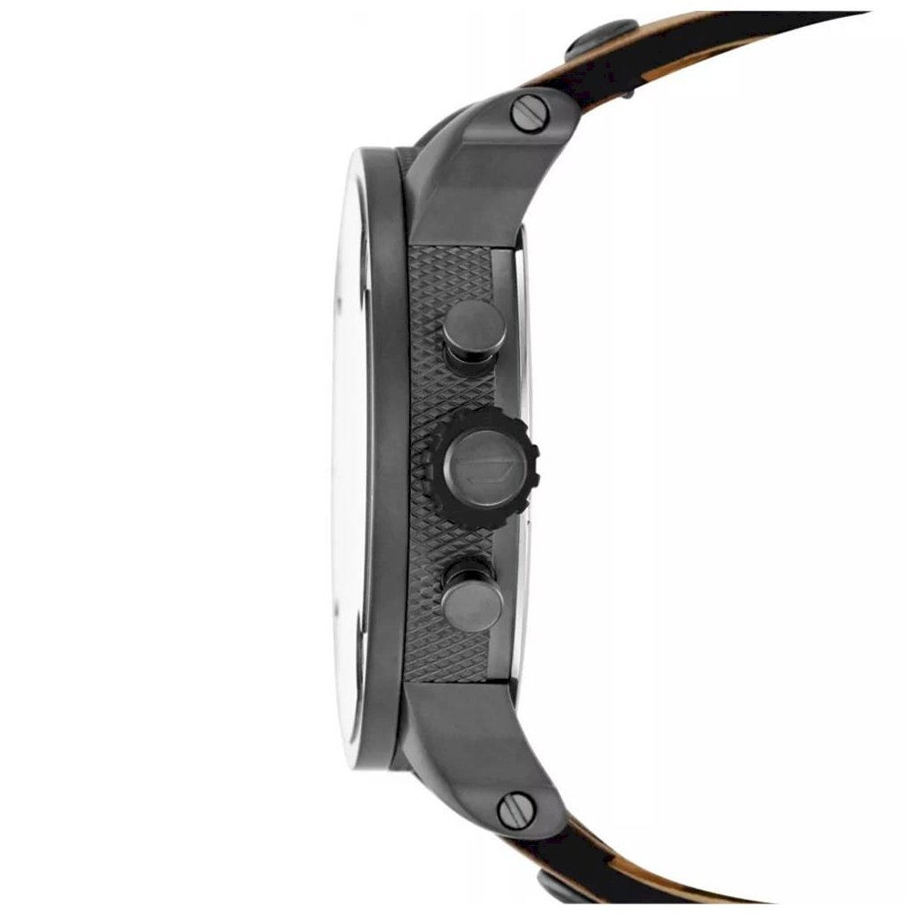 Gunmetal ion-plated stainless steel case with a tan leather strap. Fixed gunmetal ion-plated bezel. White pyramid textured dial with silver-tone hands and stick hour markers. Dual time displayed on disks at the 9 o'clock position. Dial Type: Analog. Luminescent hands and markers. Date display at the 3 o'clock position. Chronograph - three sub-dials displaying: 60 seconds, 30 minutes, and 24 hours. Quartz movement. Scratch-resistant mineral crystal. Pull/push crown. Solid case back. Case dimensions: 61 mm x 51 mm. Case thickness: 13 mm. Round case shape. Band width: 24 mm. Tang clasp. Water-resistant at 30 meters / 100 feet. Functions: date, hour, minute, second. Casual watch style. Diesel SBA Dual Time Chronograph Gunmetal IP Stainless Steel Men's Watch DZ7269.