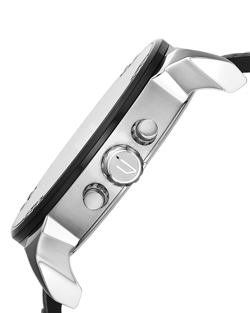 DIESEL Watch collection Mr Daddy 2.0, ref. DZ7313. The case (57 mm) is made of glossy-satin steel with black IP treatment. The multilayer dial, with 'texture' on the black bottom, features transparent black acetate inserts and metal applications, including the Diesel logo plate. This watch has 4 time zones with quartz movement, one of which has chronographic functions of hours, minutes, seconds, and more. Waterproof up to 3 ATMs. Glass in mineral crystal. Black leather strap with personalized buckle closure.