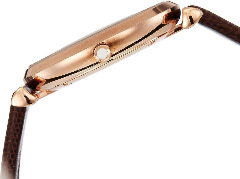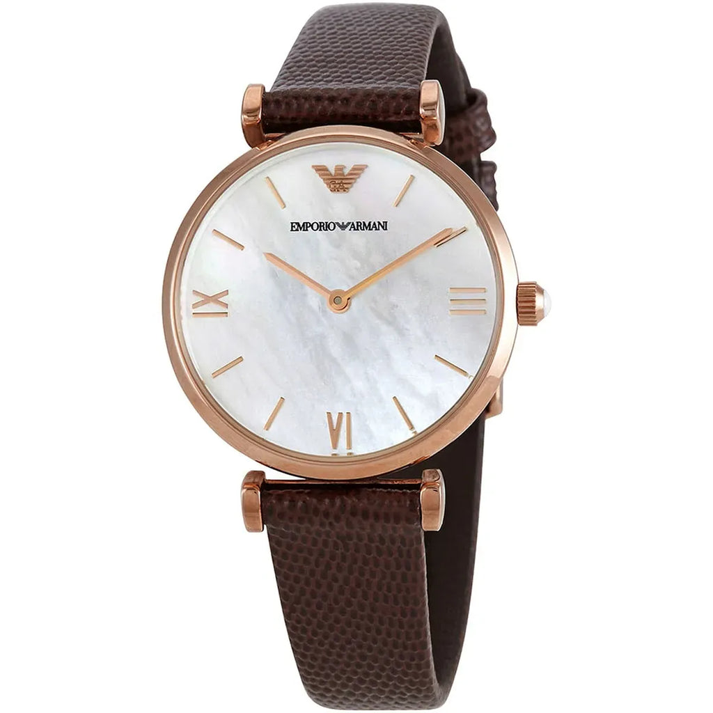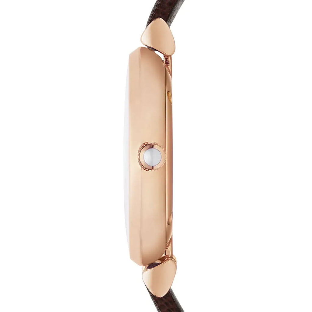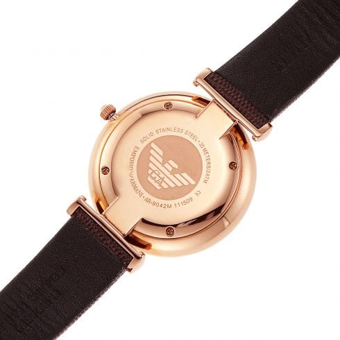 White dial enhanced by rose gold-tone hands. Rose Gold-tone stainless steel case with a brown leather band. Quartz movement. 30 meters / 100 feet water resistance. Fixed bezel. Scratch Resistant Mineral crystal. Solid caseback. Tang clasp. Pull / Push crown. Case size 40 mm. Emporio Armani AR9042 Watch.