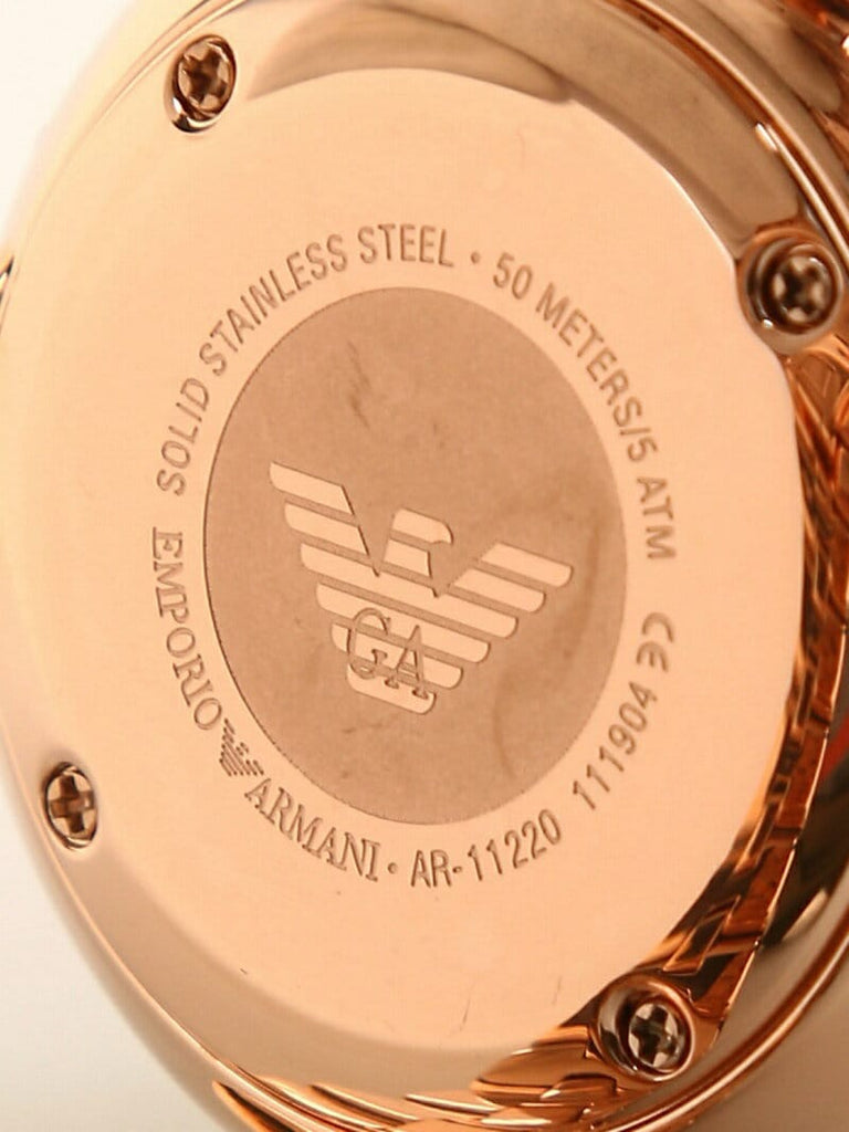 Original Emporio Armani AR11220 women's watch with all rose gold color and black and white hatched dial, which has a very special design and can be called different, this watch has a steel body and anti-scratch glass, it also has fixed color plating.