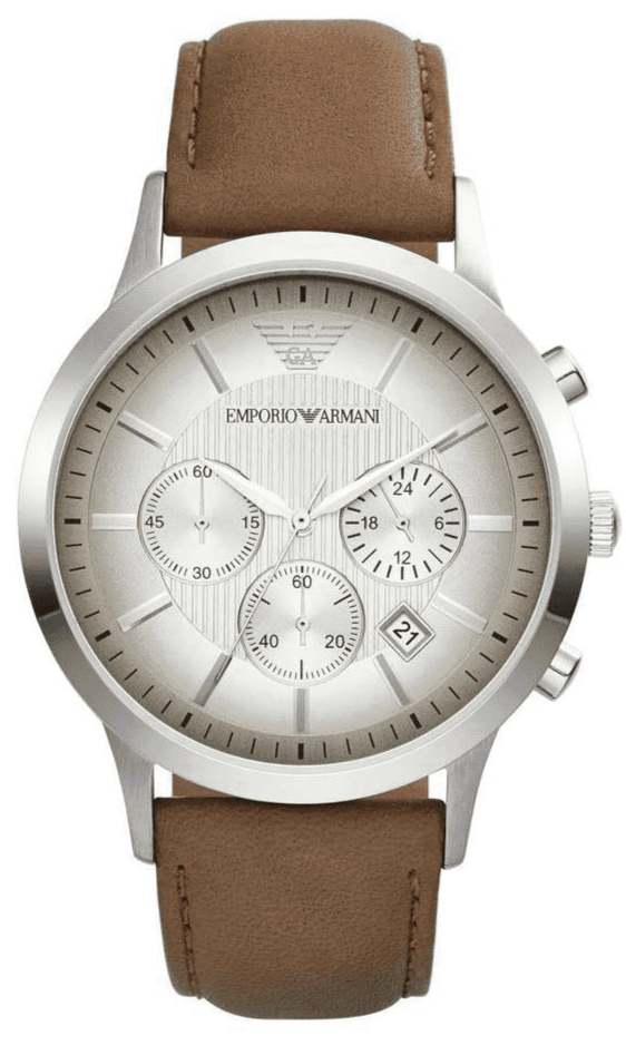 Product Name: Emporio Armani with a little bit of classic style. This watch is also suitable for business use. AR2471, Size (H x W x D): Approx. 1.7 x 1.7 x 0.4 inches (43 x 43 x 10 mm), Material: Case: Stainless Steel, Strap: Leather, Glass: Mineral Crystal, Color: Case: Silver Strap: Taupe Brown, Dial: Silver Index: Silver Handles: Movement Quartz, Arm Circumference up to approximately 7.7 inches (19.5 cm), Weight (5 g), Waterproof for daily use 1 year. Accessories: Dedicated box, instruction manual (English language not guaranteed) / Note: Date (date display), Chronograph function (60 seconds counter, 60 minute counter), 24 hour display.