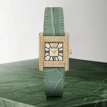 Elevate your everyday style with the Emporio Armani Classic White Dial Green Leather Strap Watch for Women. Featuring a crisp white face complemented by a rich green leather strap, this watch adds a fresh and elegant touch to any outfit. Its timeless design ensures versatile wear, while the quality craftsmanship guarantees durability and comfort. Perfect for those who appreciate understated luxury with a pop of color, this watch is a sophisticated accessory that seamlessly blends fashion and function.