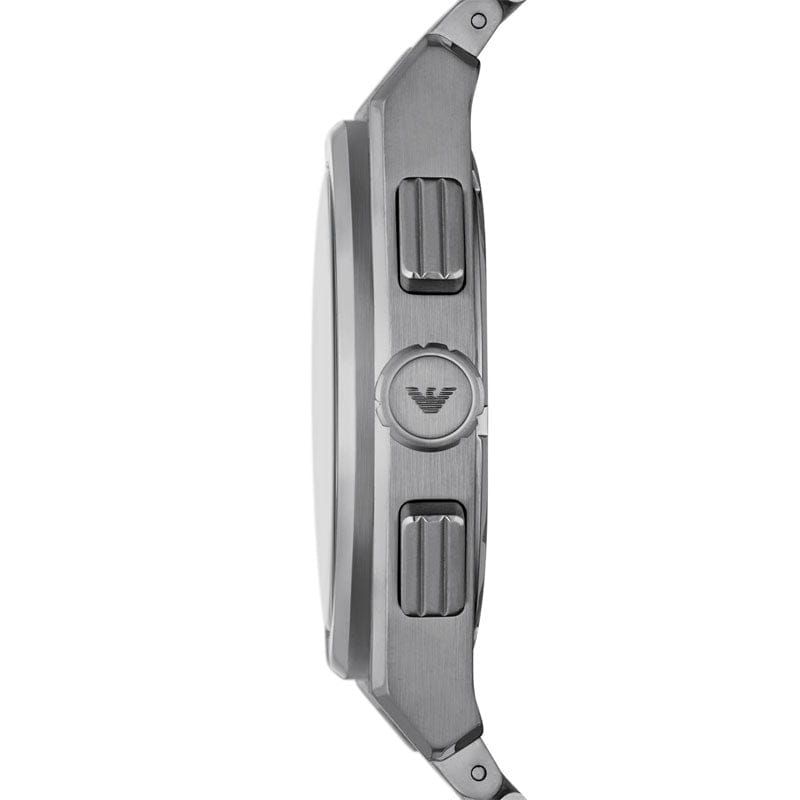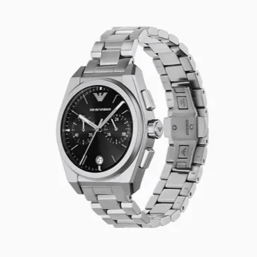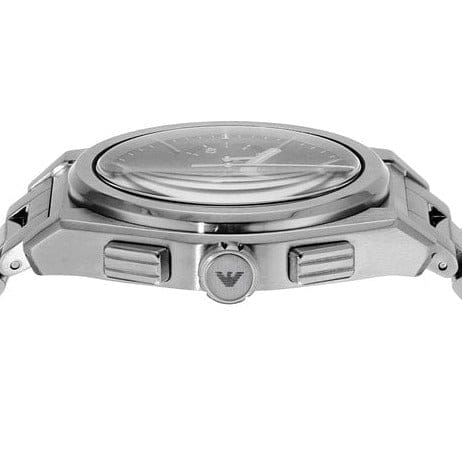 Emporio Armani's 43mm watch features a black cd finish dial, chronograph movement and stainless steel case and bracelet.