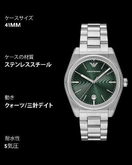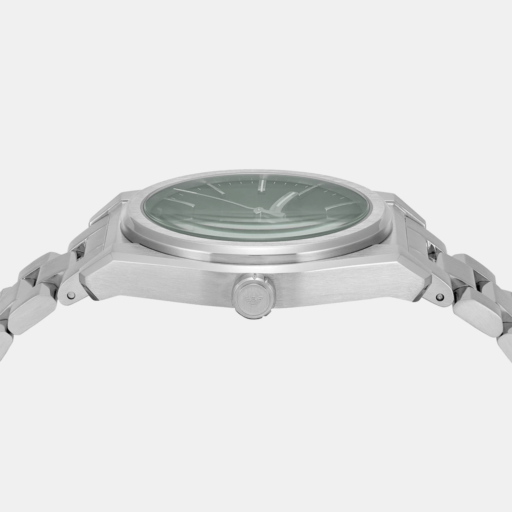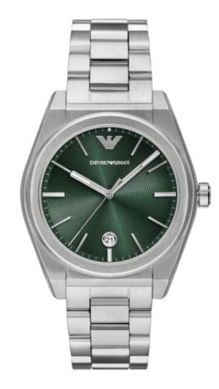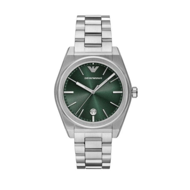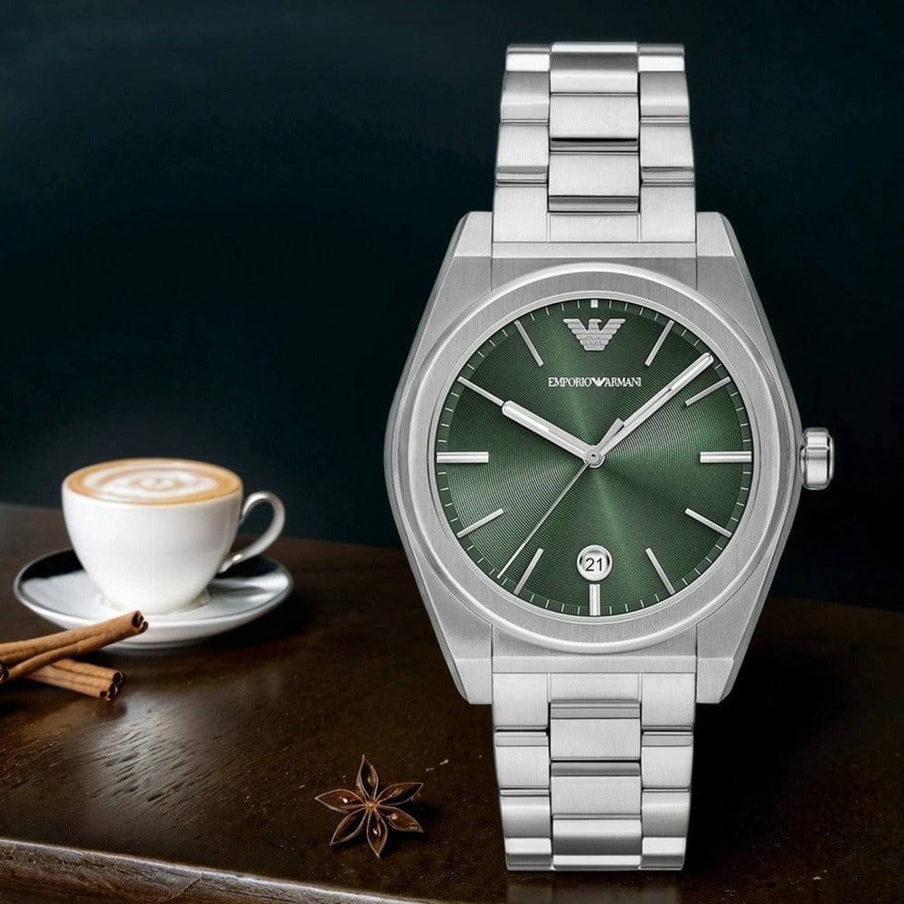 Defined by clean lines and modern flair, the Emporio Armani Three-Hand Date Green Dial Stainless Steel Watch AR11621 blends refined Italian style with everyday functionality. Its 41mm stainless steel case houses a rich green sunray dial, offering a fresh yet timeless look that sets this men's watch apart. The polished silver-tone bracelet enhances its sleek silhouette, while the mineral crystal glass provides lasting clarity. Powered by quartz movement with a three-hand display and date function, it ensures precision with effortless elegance. With a water resistance of 50 meters and durable stainless steel construction, this timepiece is as versatile as it is stylish—ideal for both formal occasions and daily wear.