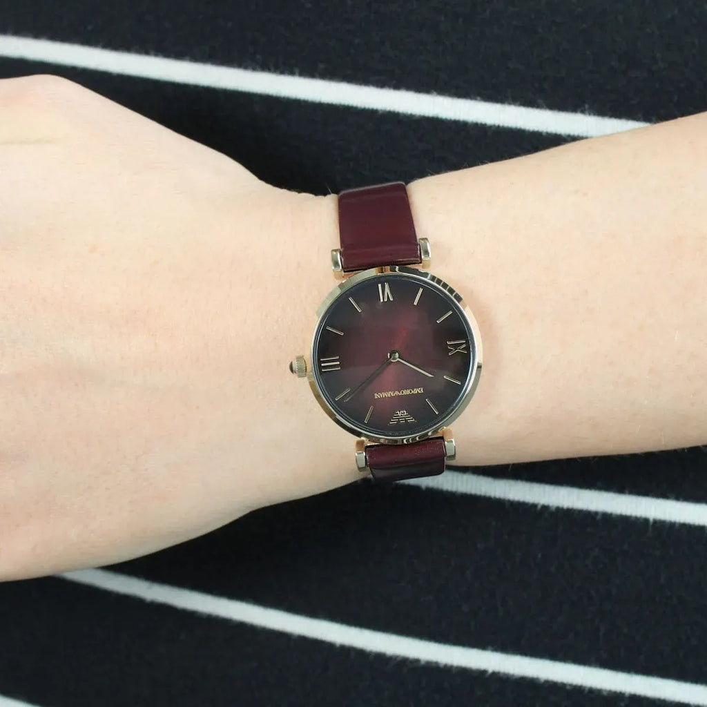 Emporio Armani Gianni T Bar Burgundy Dial Burgundy Leather Strap Watch For Women - AR1758