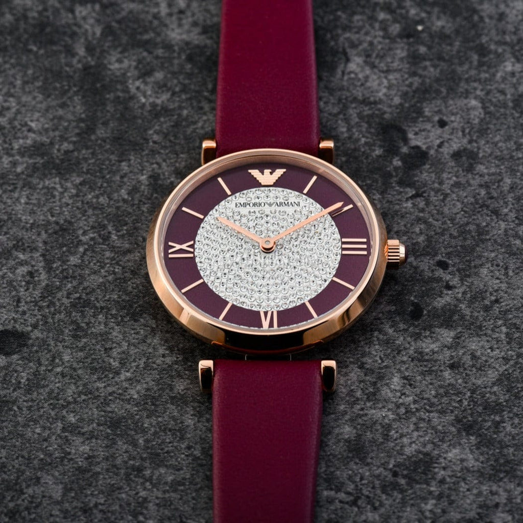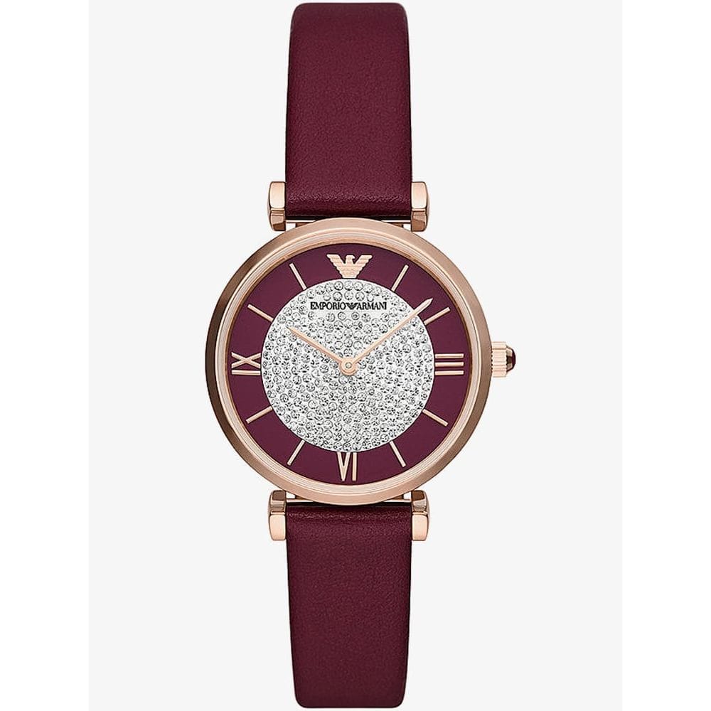 Emporio Armani's 32mm watch features a burgundy dial with full pavé stones dial, stainless steel case, two-hand movement and burgundy leather strap.