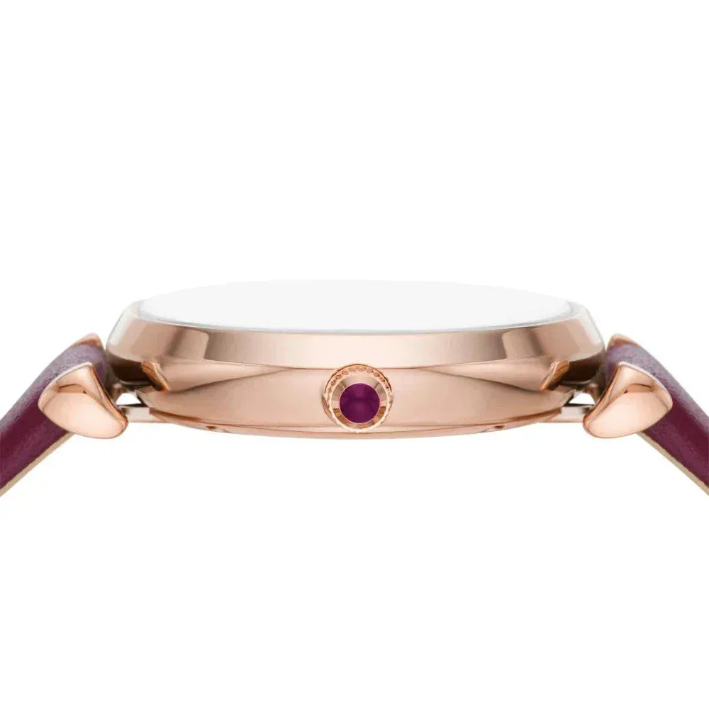- Rose Gold-tone stainless steel case with a purple leather band