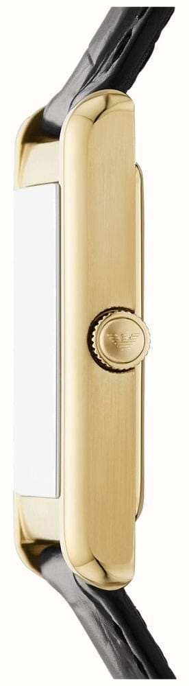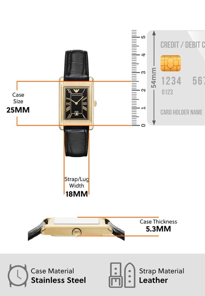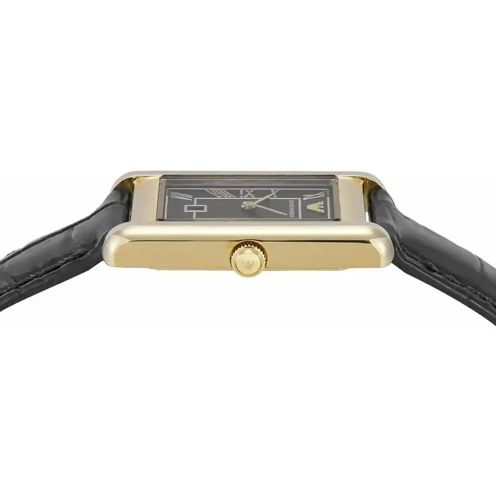 Classic elegance in gold and black – the Emporio Armani AR11666 embodies timeless style with luxurious refinement. Its rectangular gold stainless steel case, measuring 38 mm x 25 mm, with a delicate 5.3 mm case height, presents a striking yet elegant aesthetic. The semi-matte finish adds subtle sophistication, while the deep black dial with Roman numerals exudes vintage charm.
