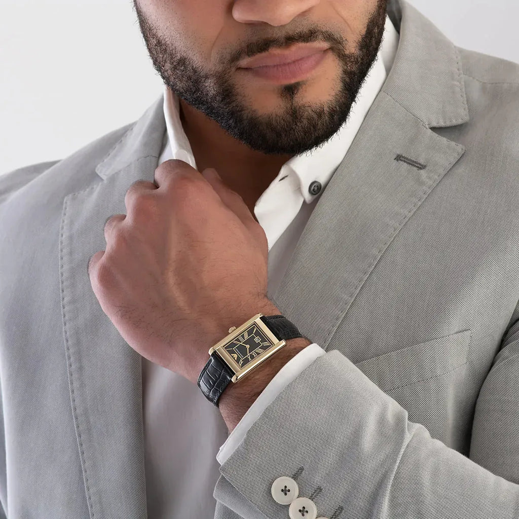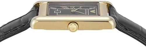 • This model exhibits a rectangular black dial with a date aperture at 6 o'clock.