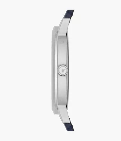 Stainless steel case with a blue leather strap. Fixed stainless steel bezel. Blue dial with silver-tone hands and index hour markers. Roman numerals mark the 3, 6, 9 and 12 o'clock positions. Minute markers around the outer rim. The Emporio Armani Eagle appears at the 12 o'clock position. Dial Type: Analog. Quartz movement.