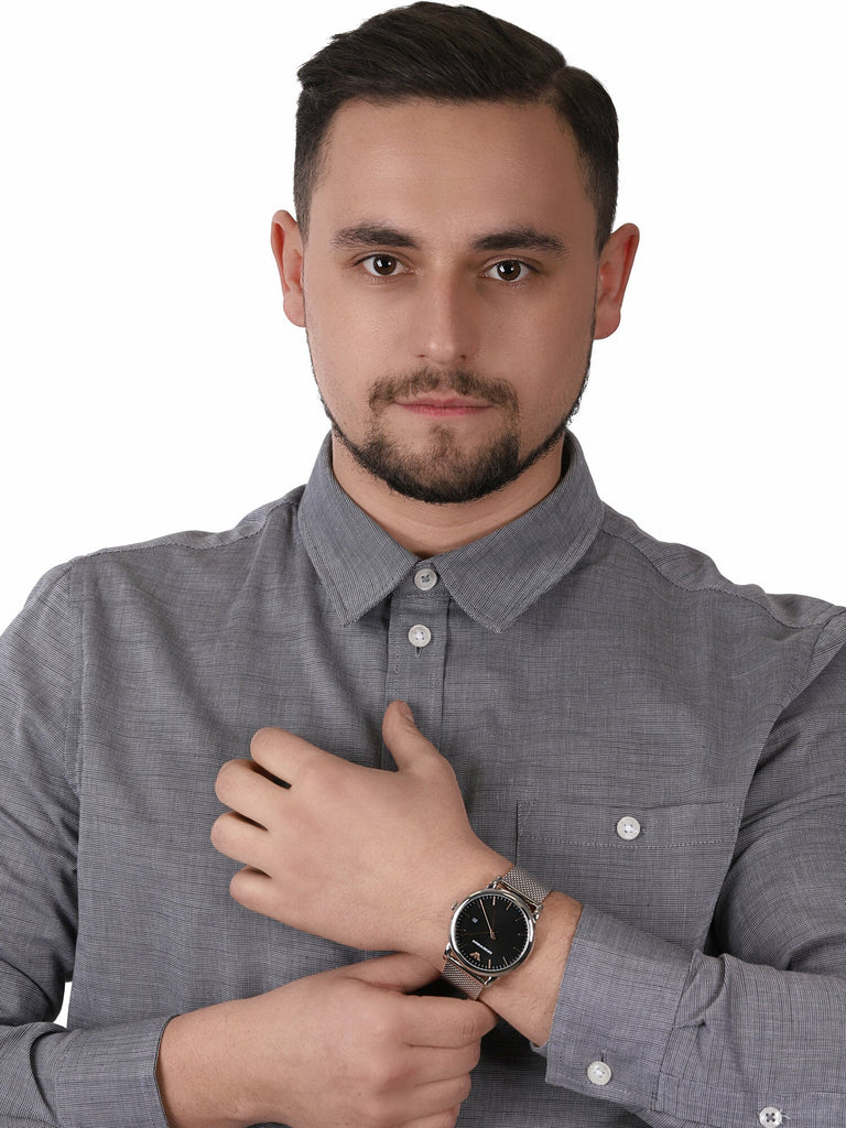 A brushed black dial features thoughtful detailing, with only hands and a small date function. Housed in a PVD-plated stainless steel case on a mesh strap, this timepiece is ideal for both everyday and evening wear.