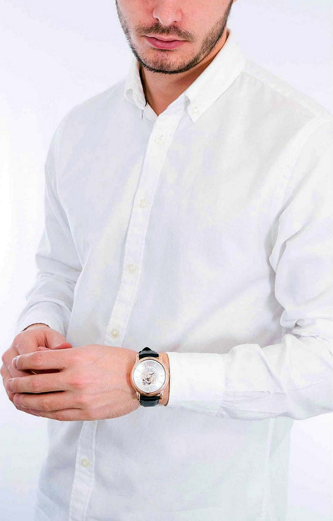 Silver (Skeleton Window) dial enhanced by luminous rose gold-tone hands. Rose Gold-tone stainless steel case with a black leather band. Automatic movement. 50 meters / 165 feet water resistance. Fixed bezel. Scratch Resistant Mineral crystal. Transparent caseback. Tang clasp. Pull / Push crown. Case size 43 mm x 12 mm. Band 20 mm x long. Emporio Armani AR60013 Luigi Watch.
