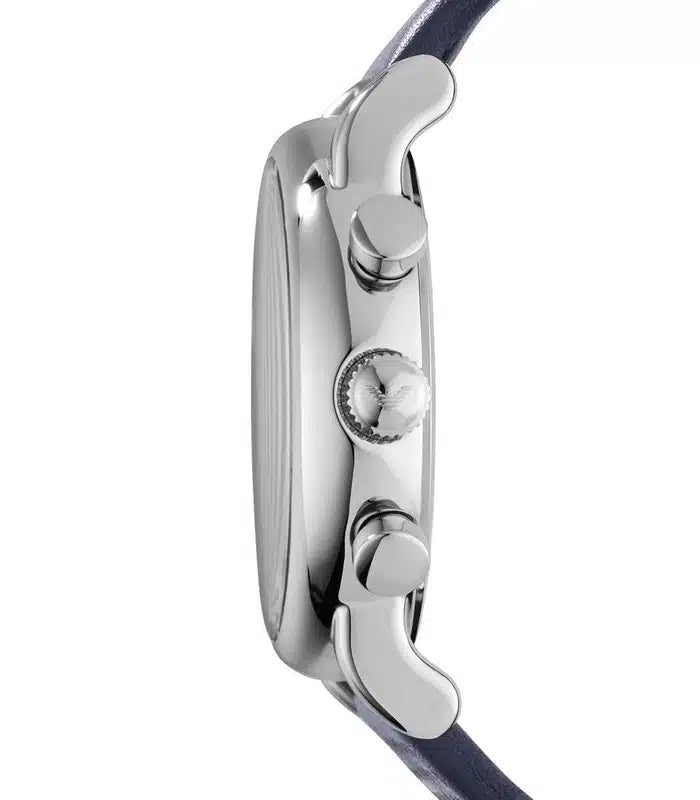 Classic style from Emporio Armani, simplistic in its design, but superbly crafted with top quality materials and finishing. The case is a solid stainless steel construction, with soft edges and smooth polishing, surrounding a quartz movement with date, chronograph and 24 hour subdials, water resis tant to 5atm. These are displayed on a subtle blue dial, with simple baton markers, and matched to a soft perforated blue leather strap, evocative of historical sports car seats.