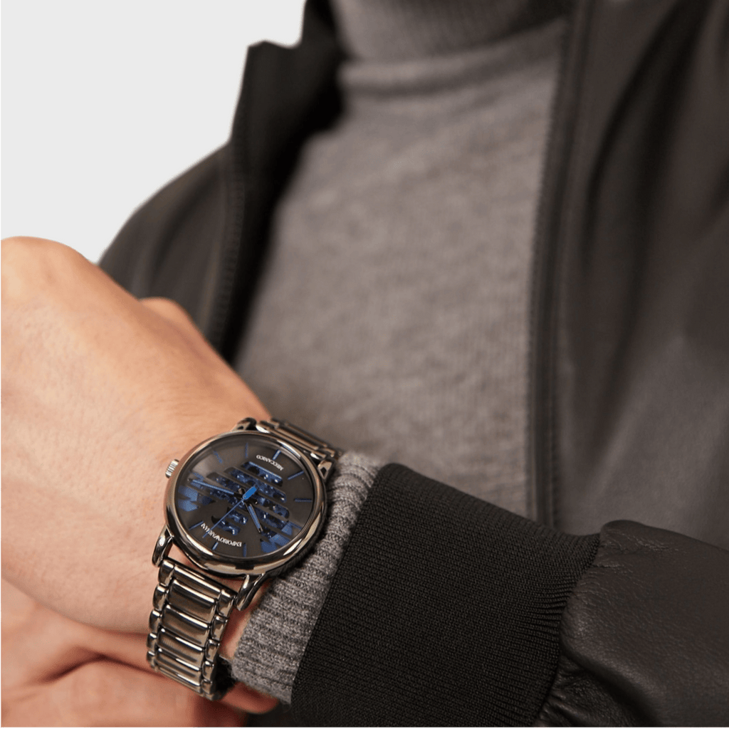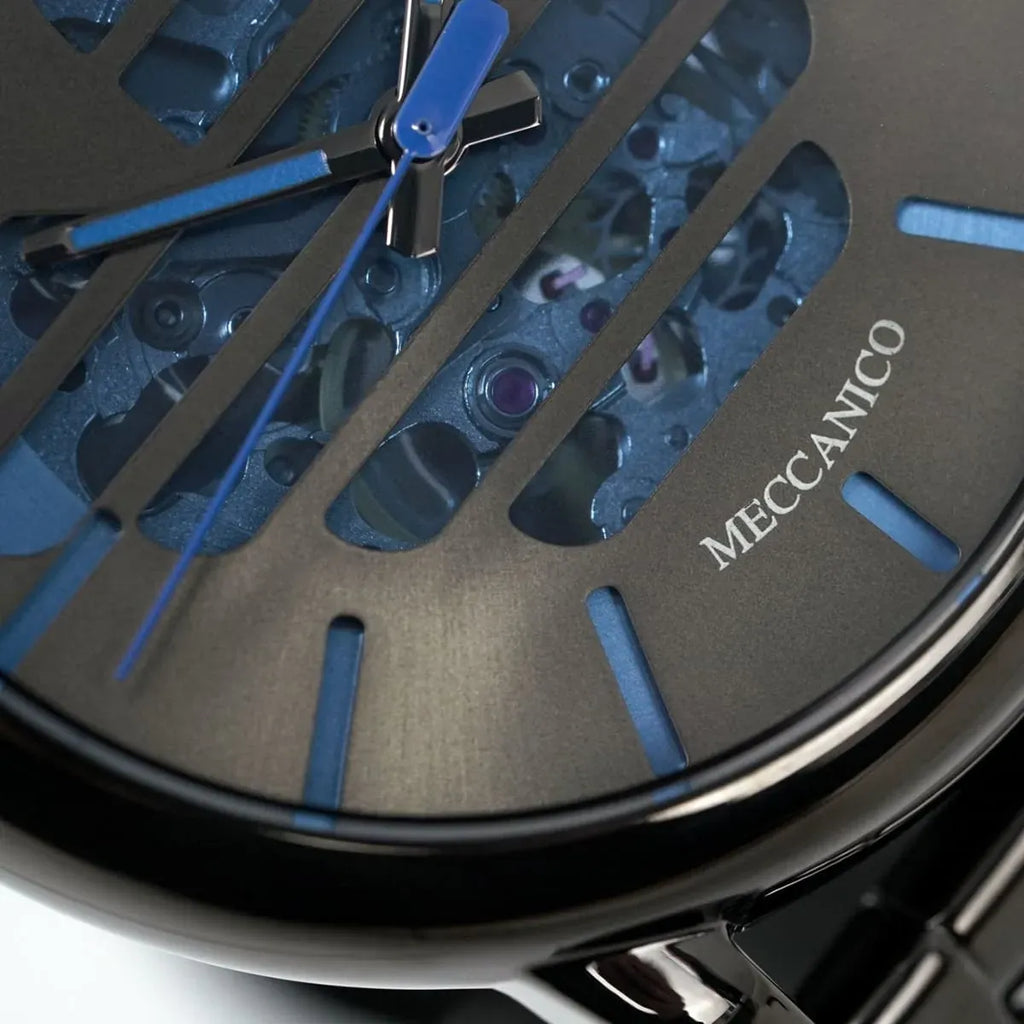 This 43mm watch features a gunmetal sunray dial with a blue eagle skeleton cutout and tonal indexes, three-hand movement and gunmetal stainless steel bracelet.