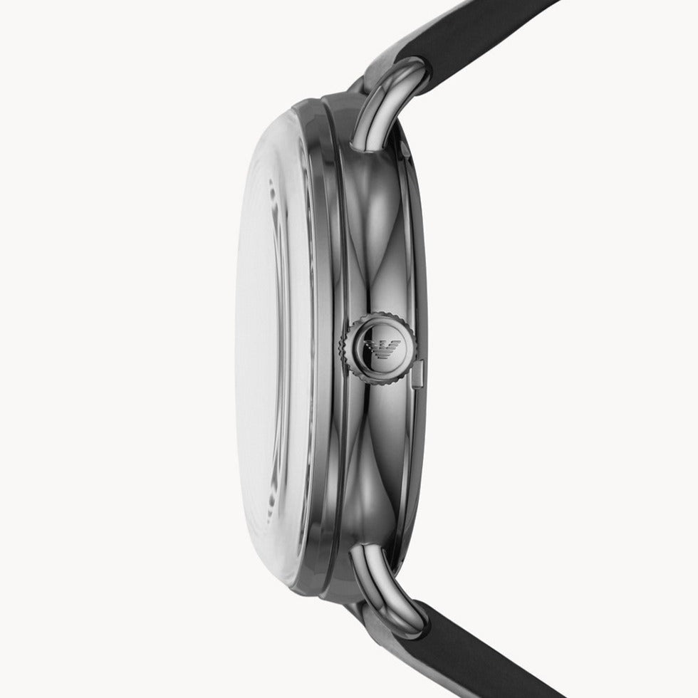 In first glance, what draws the eye to this timepiece is its time-keeping mechanism which appears to float in the air. The Aviator from Emporio Armani shows you how it's done, in every sense of the phrase! A 43mm watch, it features a black skeleton dial with silver-tone stick indexes, multifunction movement and a black leather strap.