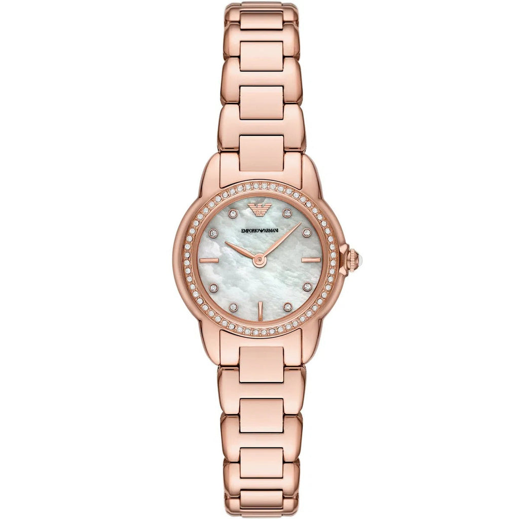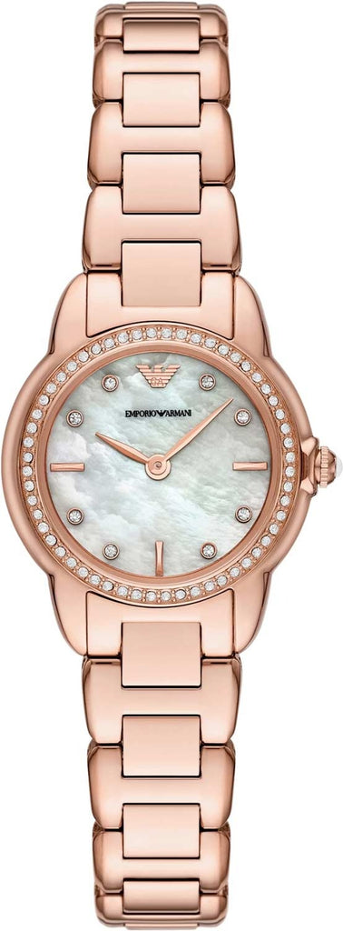 Emporio Armani's 26mm petite stainless steel watch showcases a glossy white mother-of-pearl dial in a round case with a two-hand quartz movement. The sleek rose gold-tone stainless steel bracelet makes this a beautiful addition to an ensemble for any occasion.