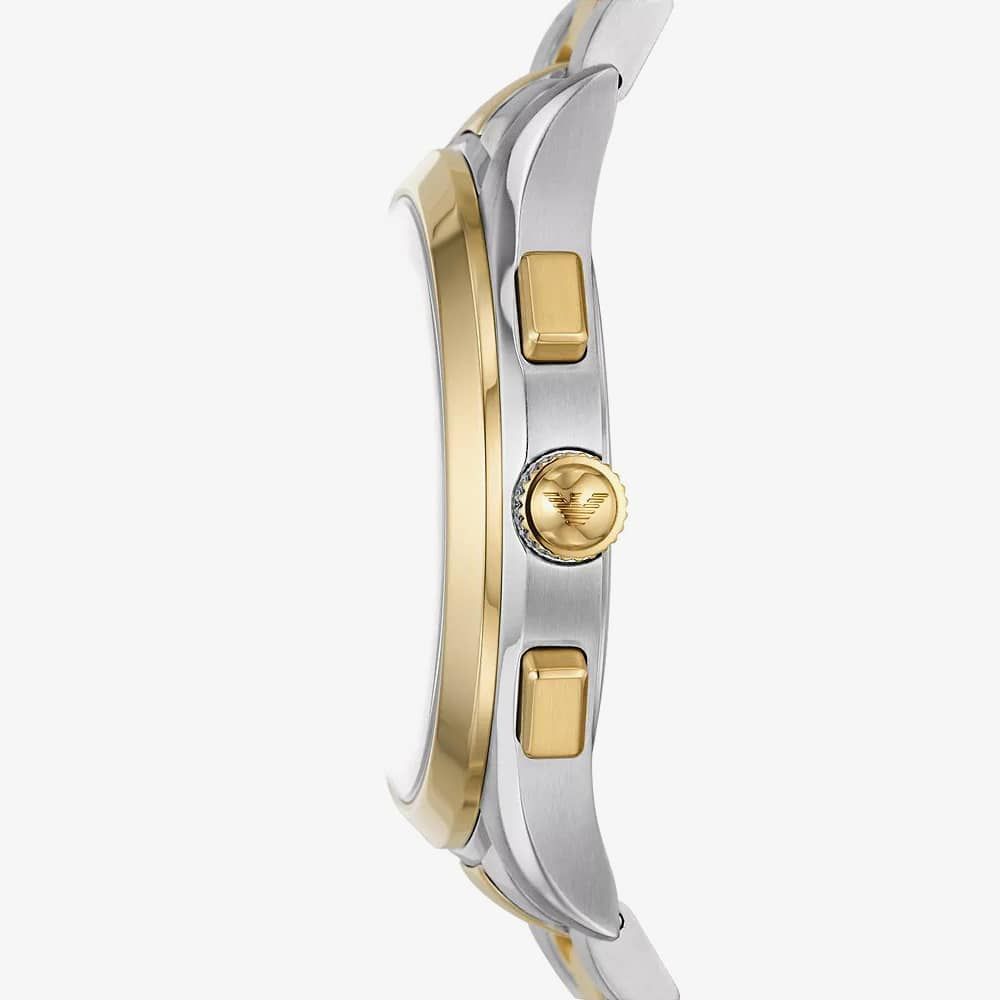 Emporio Armani's 42mm watch features a blue textured cd sunray dial, chronograph movement and two-tone stainless steel bracelet.