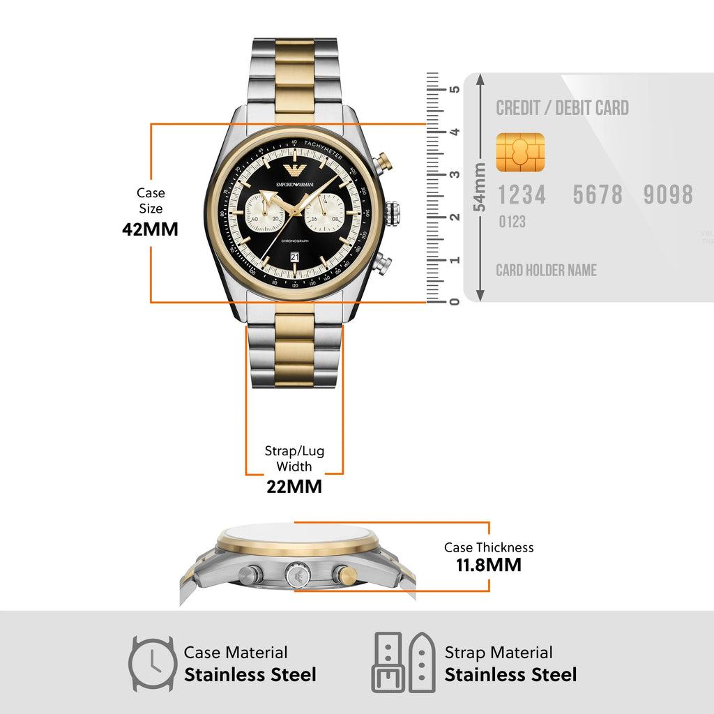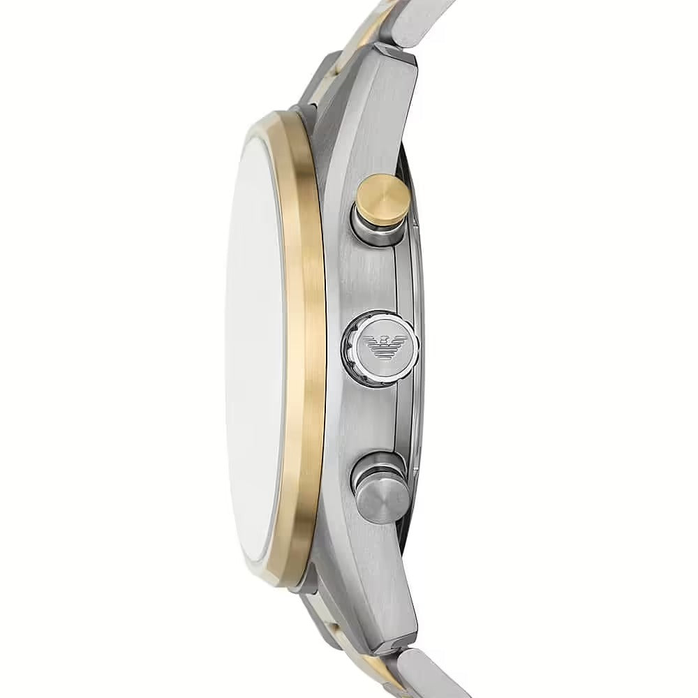 Crafted for the modern man, the Emporio Armani Chronograph AR11678 is a refined men's watch that blends bold design with timeless elegance. Its 42mm stainless steel case houses a striking black dial with white sub dials, offering sharp contrast and elevated readability. The brushed silver and gold-tone bracelet adds a luxurious finish, combining warm and cool metals for a sophisticated edge.