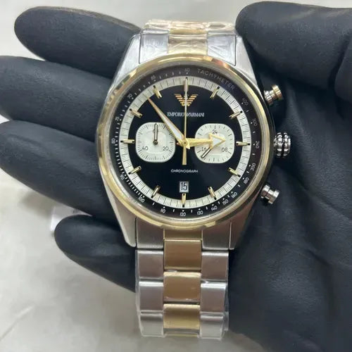 The Emporio Armani Racer Chronograph blends bold style with precise functionality, featuring a sleek black dial contrasted by a two-tone steel strap. Designed for men who value sophistication and performance, this watch offers reliable chronograph features for seamless timekeeping. Its durable construction and timeless design make it the perfect accessory to elevate both casual and formal looks effortlessly.