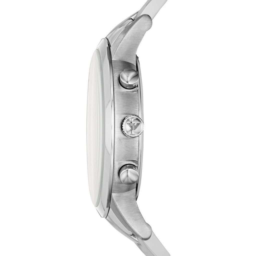 Blue Dial with Stainless Steel Hands and Baton Hour Markers. 24 Hour Counter at 12 O'Clock. Small Seconds at 6 O'Clock. 30 Minute Counter at 9 O'Clock. Date Window between 4 and 5 O'Clock and Armani Logo at 12 o’clock