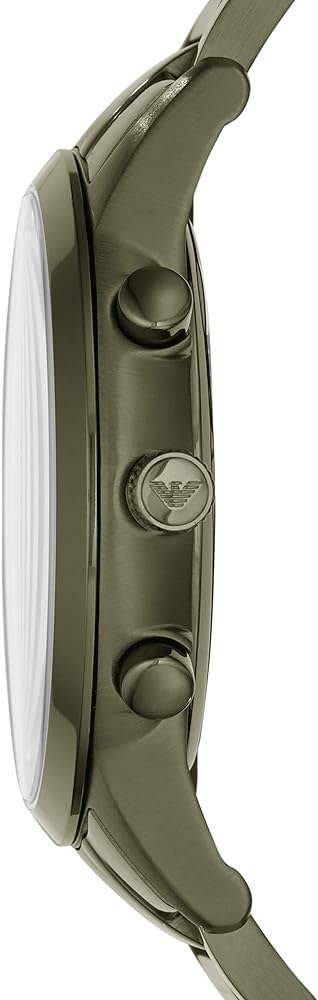 With this watch, be prepared to get noticed amidst the crowd. This men's analog watch by Emporio Armani features a polished green IP case, gray chronograph dial, three sub-dials with silver-tone stick indexes, three silver hands, and stainless steel with a three-link bracelet, which further compli ments the look of the watch. Clock With Quartz Movement With Chronograph.