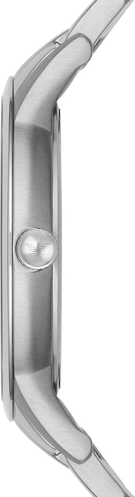 This Emporio Armani watch features a gunmetal dial with a date window and rose gold-tone indexes, accented by a stainless-steel case and bracelet with brushed and polished links.