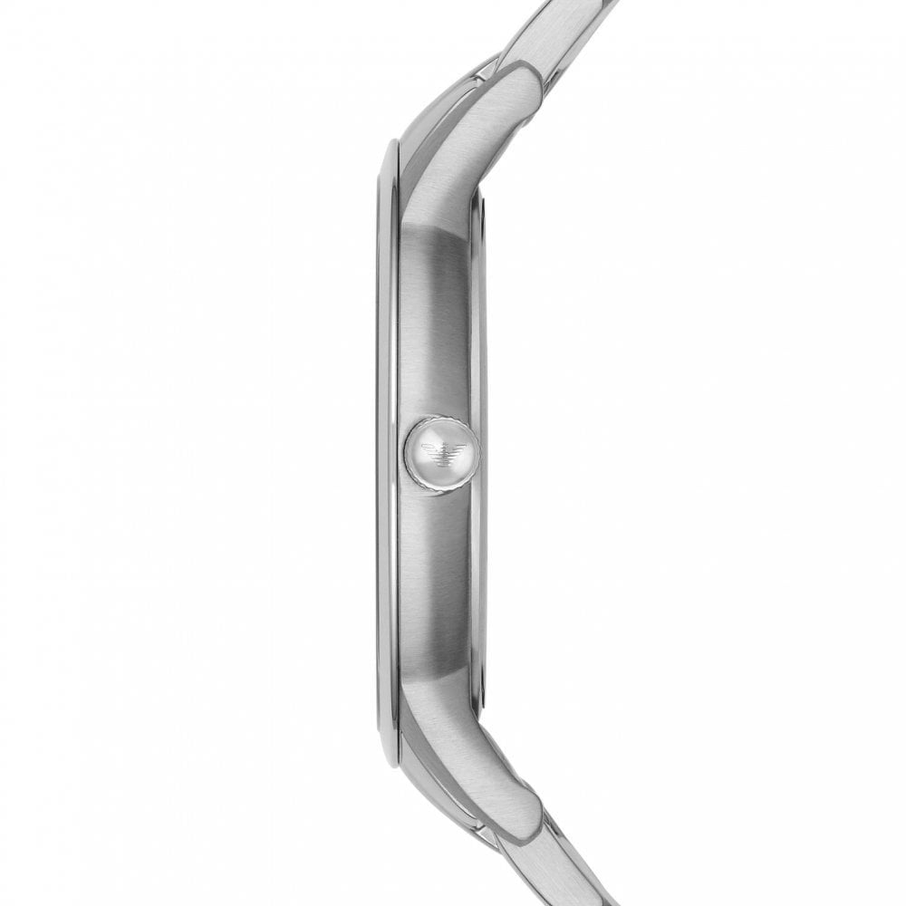- This Emporio Armani Watch features a bronze dial with a date window and rose gold-tone indexes, accented by a stainless steel case and bracelet with brushed and polished links.