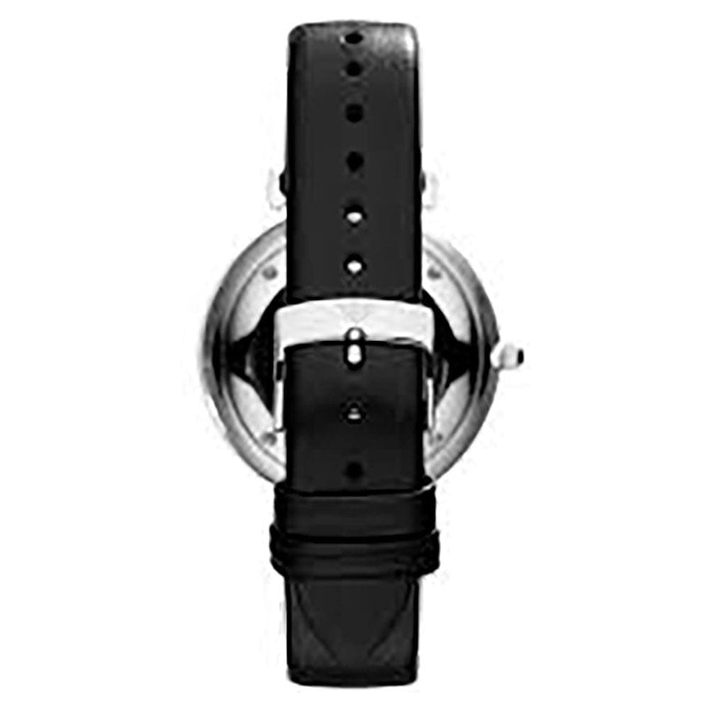 Stainless steel case with a black leather strap. Fixed stainless steel bezel. Silver dial with silver-tone hands and index hour markers. Roman numerals mark the 3, 6 and 9 o'clock positions.The Emporio Armani logo appears at the 12 o'clock position. Dial Type: Analog. Small seconds sub-dial at the 6 o'clock position.