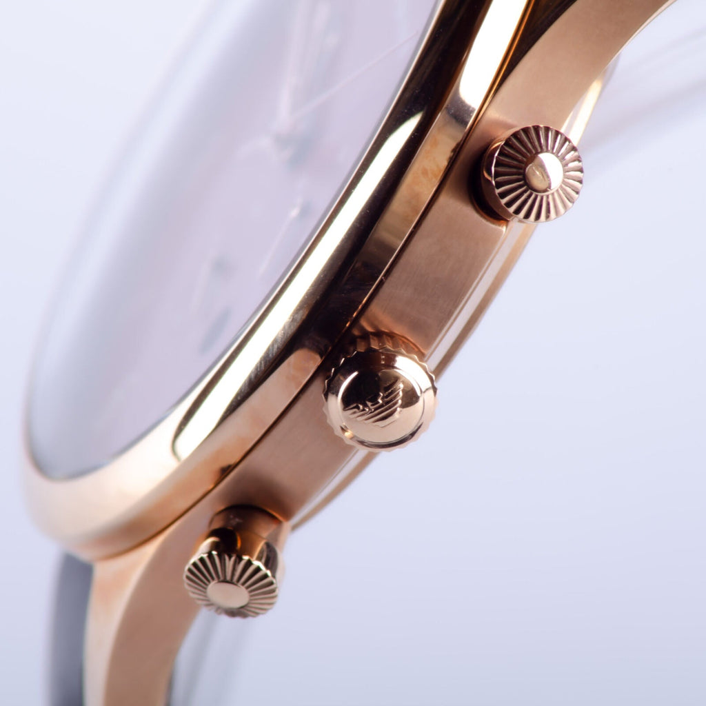 Rose gold-tone stainless steel case with a dark brown leather strap. Fixed rose gold-tone bezel. Burgundy dial with rose gold-tone hands and alternating Arabic numeral and index hour markers. Minute markers around the outer rim. The Emporio Armani logo appears at the 12 o'clock position. Dial Type: Analog. Date display at the 4 o'clock position. Chronograph - three sub-dials displaying: 60 seconds, 60 minutes, and 24 hours. Quartz movement. Scratch resistant mineral crystal. Pull / push crown. Solid case back. Case size: 43 mm. Case thickness: 12 mm. Round case shape. Band width: 22 mm. Tang clasp. Water resistant at 50 meters / 165 feet. Functions: chronograph, date, hour, minute, second. Casual watch style. Armani Classic Chronograph Burgundy Dial Men's Watch AR1890.