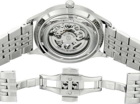 Automatic movement. Scratch resistant mineral crystal. Pull / push crown. Transparent case back. Round case shape. Case size: 43 mm. Case thickness: 13 mm. Band width: 22 mm. Fold over clasp. Water resistant at 50 meters / 165 feet. Functions: hour, minute, second. Dress watch style. Emporio Armani Dress Automatic Silver Dial Men's Watch AR1945.