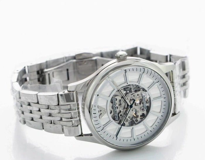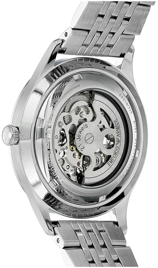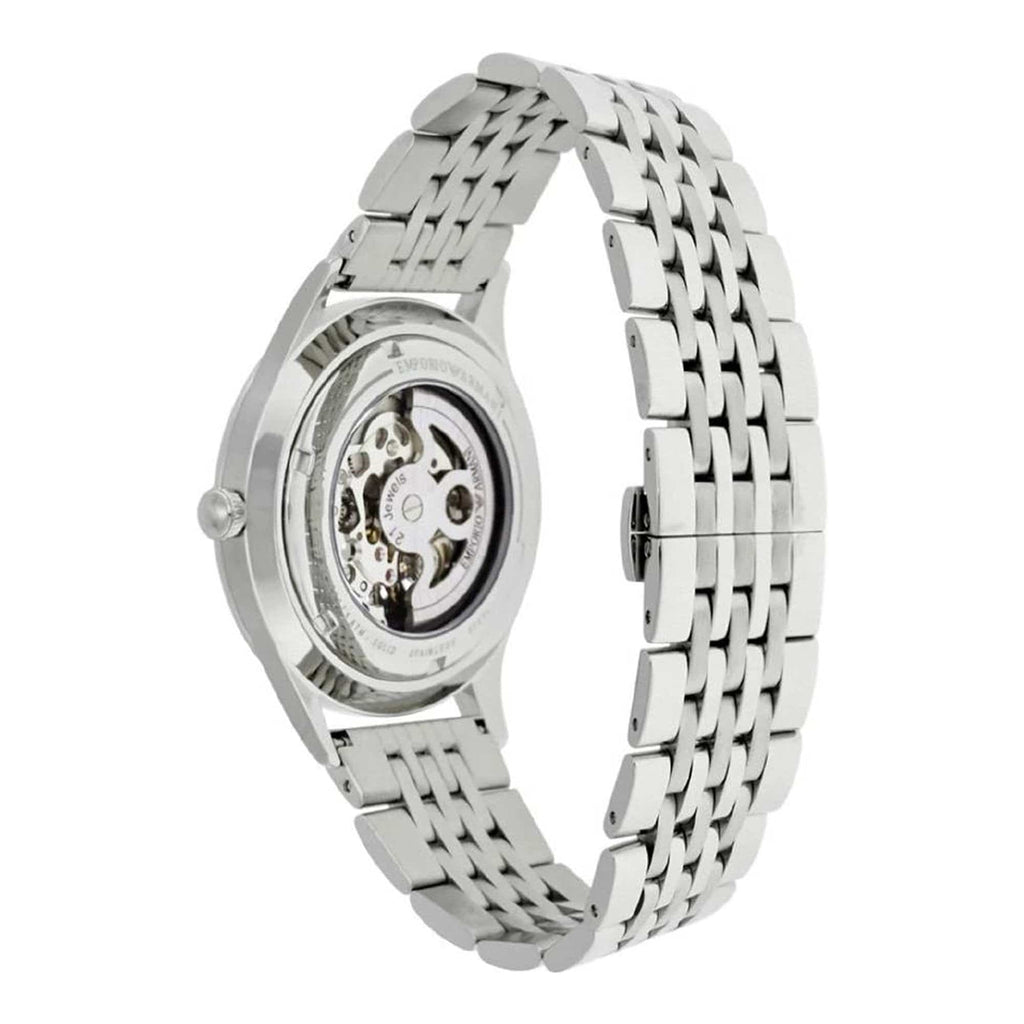 Stainless steel case with a stainless steel bracelet. Fixed stainless steel bezel. Silver (skeleton center) dial with silver-tone skeleton hands and index hour markers. Minute markers around the outer rim. The Emporio Armani logo appears at the 12 o'clock position. Dial Type: Analog.