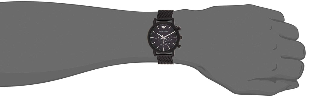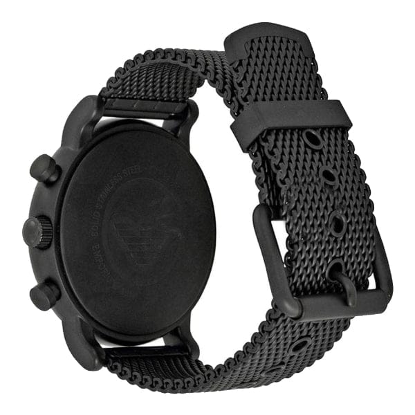 This Emporio Armani Sport Chronograph Black Dial Men's Watch AR1968 comes in black ion-plated stainless steel case with a black ion-plated stainless steel mesh bracelet. Fixed black ion-plated bezel. Black dial with luminous silver-tone hands and index hour markers. Minute markers around the outer rim. The Emporio Armani logo marks the 12 o;clock position. Dial Type: Analog. Luminescent hands and markers. Date display between the 4 and 5 o'clock positions.