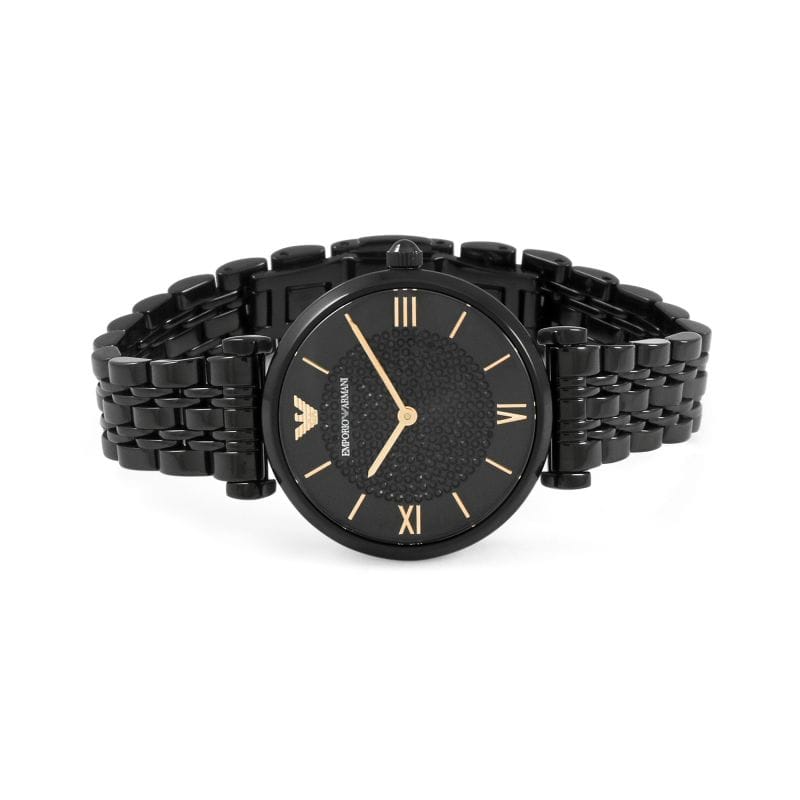 This 32mm Emporio Armani Black Dial Stainless Steel Ladies Watch AR11245 features a black dial with pavé stones, rose gold-tone Roman numerals and stick indexes, two-hand movement and black stainless steel bracelet.