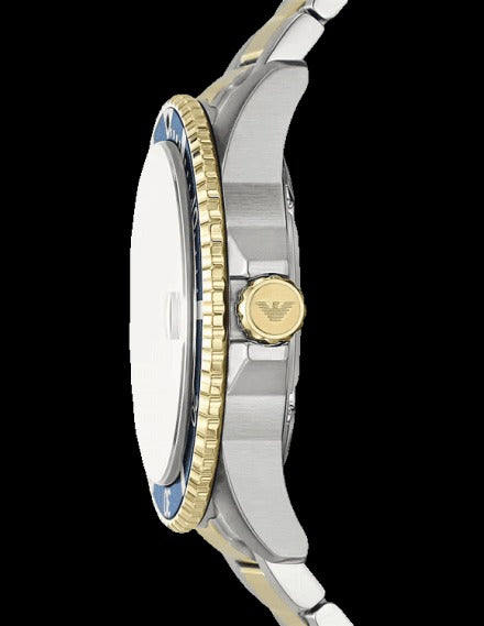 Emporio Armani's 42mm World Explorer watch features a striking blue sunray dial, three-hand date movement, and a two-tone stainless steel bracelet. Elevated design details like luminous accents on the hands, indexes, and bezel markings, and a magnifying window over the date at 3 o'clock, combined with the sport-driven design aesthetic, make this watch perfect for any occasion.
