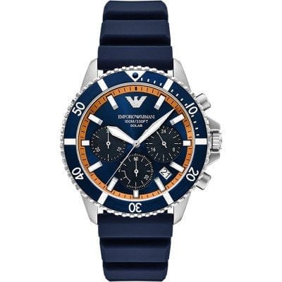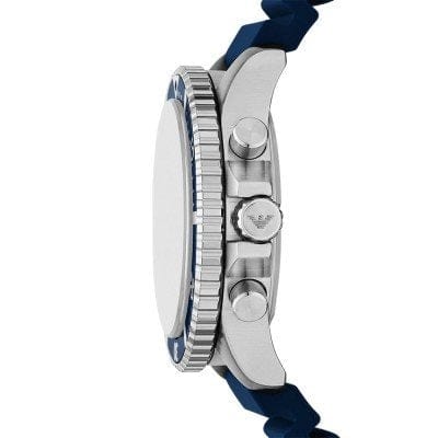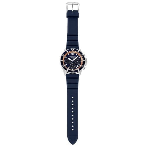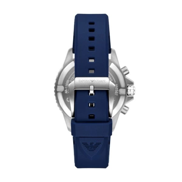 The deep blue silicone strap ensures a comfortable, secure fit while enhancing its sporty sophistication. Water-resistant up to 100 meters, this chronograph is designed for both style and resilience, embodying the refined yet adventurous spirit of Emporio Armani.
