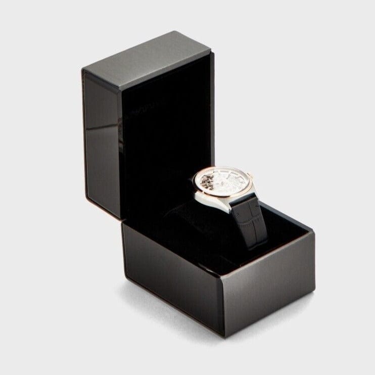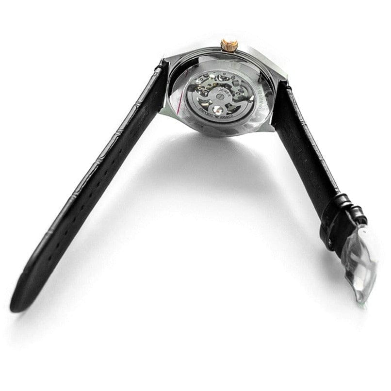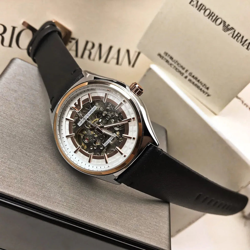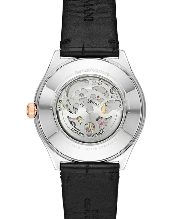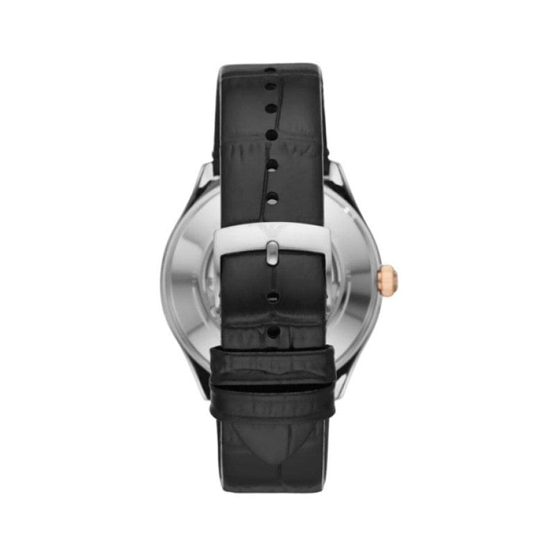 Emporio Armani Zeta Skeleton Automatic Silver Dial Black Leather Strap Watch For Men - AR60018