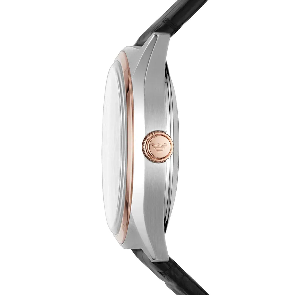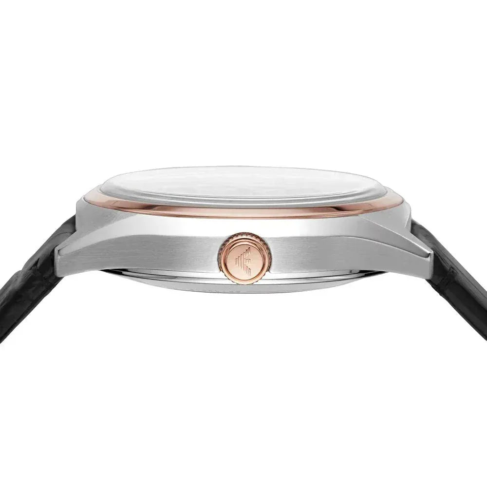 Stainless steel case with a black leather strap. Fixed rose gold-tone bezel. White (skeleton center) dial with luminous rose gold-tone hands and index hour markers. Minute markers around the outer rim. The Emporio Armani Eagle appears at the 12 o'clock position. Dial Type: Analog. Luminescent hands and markers.