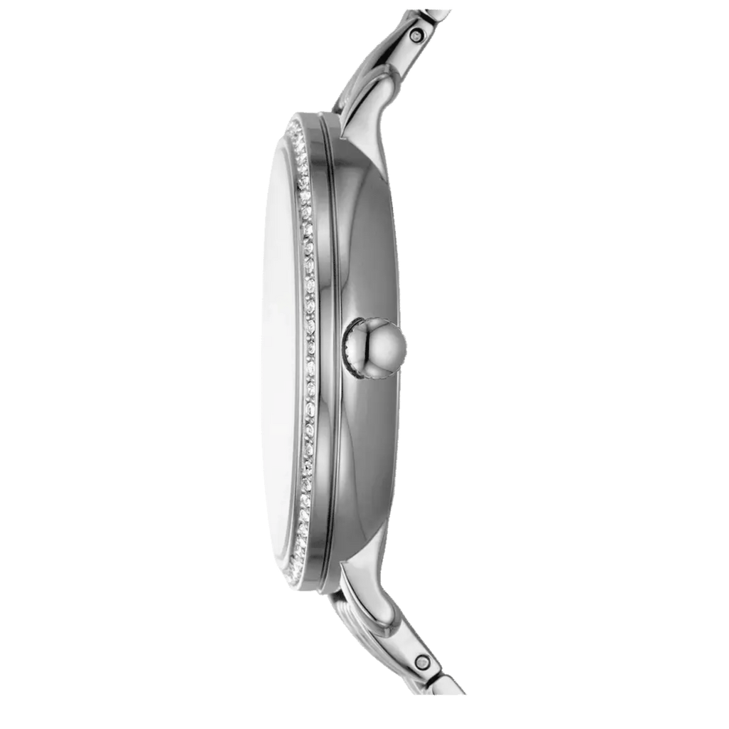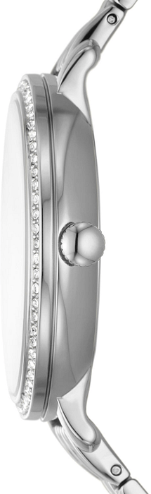 Fossil Jacqueline ES5164 is an elegant ladies' watch with a silvery stainless steel bracelet and a matching steel bracelet. The case measures 36 mm in width and 7 mm in thickness, while the bracelet measures 14 mm in width. The watch has a date display and the bezel is adorned with clear crystals. Fossil watches have a warranty of up to two years and are delivered in the original packaging of the manufacturer.
