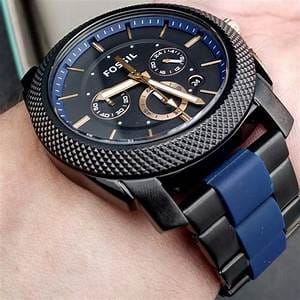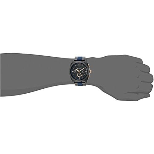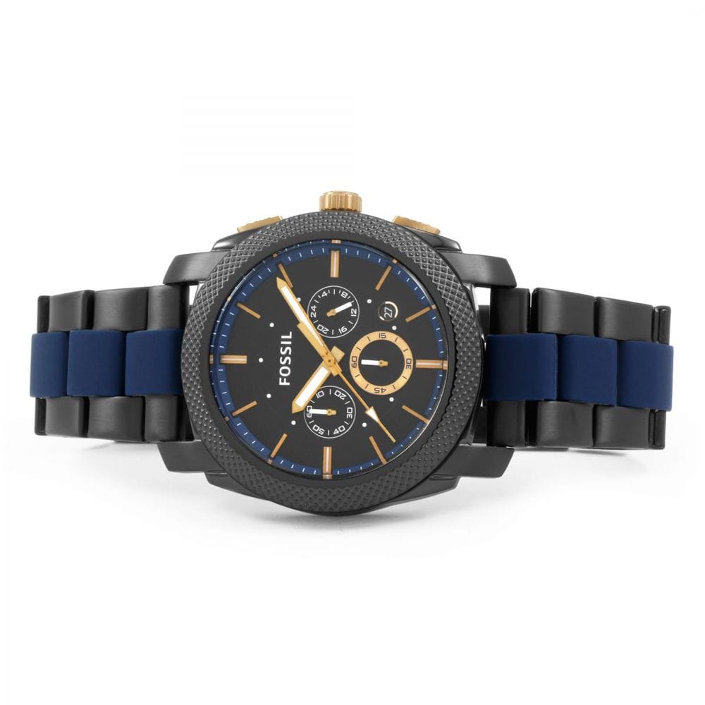 Scratch resistant mineral crystal. Solid case back. Case size: 45 mm. Case thickness: 12 mm. Round case shape. Band width: 24 mm. Deployment clasp with a push button release. Water resistant at 50 meters / 165 feet. Functions: chronograph, date, hour, minute, second. Additional Info: in general, suitable for short periods of recreational swimming, but not diving or snorkeling. Dress watch style. Fossil Machine Chronograph Men's Watch FS5164.