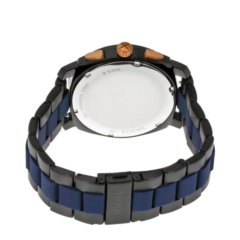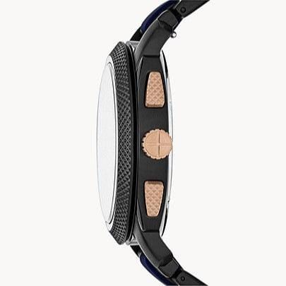 Black ion-plated stainless steel case with a black ion-plated stainless steel bracelet with blue silicone center. Fixed black ion-plated bezel. Black dial with luminous rose gold-tone hands and index hour markers. Minute markers around the outer rim. Dial Type: Analog. Luminescent hands and markers. Date display between the 4 and 5 o'clock positions. Chronograph - three sub-dials displaying: 60 second, 60 minute and 24 hours. Quartz movement.