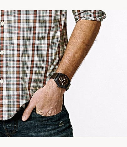 Chronograph – three sub-dials displaying: 60 second, 30 minute and 24 hour. Quartz movement. Scratch resistant mineral crystal. Solid case back. Case diameter: 42 mm. Case thickness: 12 mm. Round case shape. Band width: 21 mm. Tang clasp. Water resistant at 50 meters / 165 feet. Functions: chronograph, date, hour, minute, second. Casual watch style. Fossil Machine Flight Chronograph Brown Dial Mens Watch FS4656