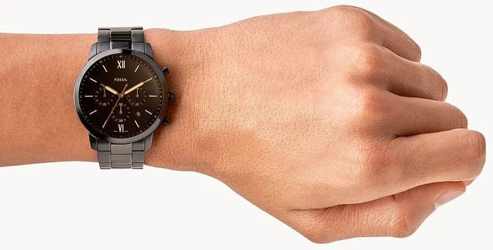 Fossil Neutra Chronograph FS5525 is a practical and special Gents watch. Case is made out of Stainless Steel, which stands for a high quality of the item while the dial colour is Black. This 44 mm Neutra features a black satin dial with an amber crystal, chronograph movement and a black stainless steel bracelet.