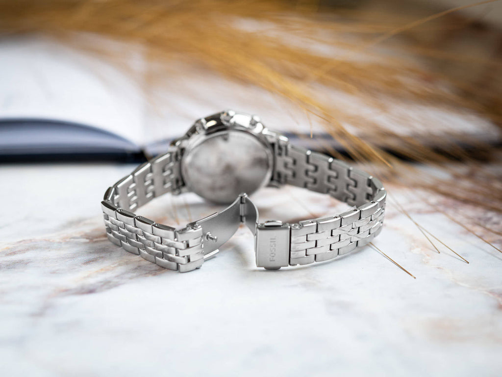 Introducing the striking Fossil Neutra Chronograph Silver Tone Ladies Watch | ES5217. This exquisite watch effortlessly combines function and style. With its precise chronograph movement and elegant Silver tone design, it is the perfect accessory for any sophisticated event or everyday wear. Upgrade your wardrobe with this luxurious timepiece.