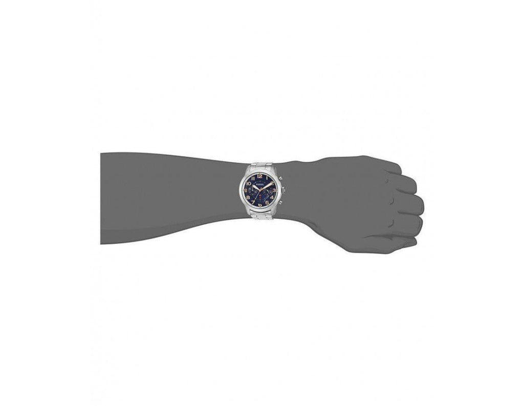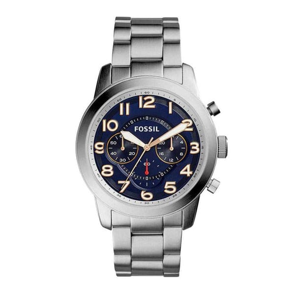 This Fossil Pilot 54 Chronograph Navy Blue Dial Men's Watch FS5203 comes in stainless steel case with a stainless steel bracelet. Fixed stainless steel bezel. Navy blue dial with luminous rose gold-tone hands and Arabic numeral hour markers. Minute markers around the outer rim. Dial Type: Analog. Luminescent hands and markers. Chronograph - three sub-dials displaying: 60 second, 60 minute and 24 hours. Quartz movement. Scratch resistant mineral crystal. Pull / push crown. Solid case back. Case size: 44 mm. Case thickness: 12 mm. Round case shape. Band width: 22 mm. Deployment clasp with a push button release. Water resistant at 50 meters / 165 feet. Functions: chronograph, hour, minute, second. Casual watch style.