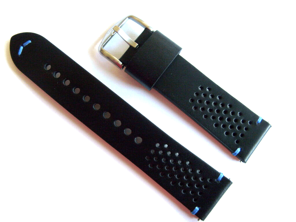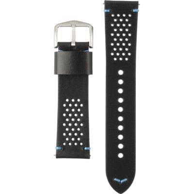 Silver-tone stainless steel case with a black leather strap. Uni-directional rotating black and blue (Batman) top ring stainless steel bezel. Black dial with luminous blue hands and index hour markers. Minute markers around the outer rim. Dial Type: Analog. Luminescent hands and markers. Day of the week and date display at the 3 o’clock position.