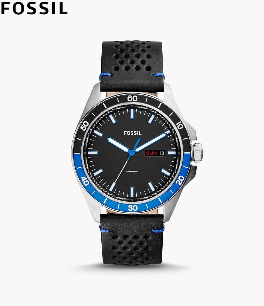 Fossil Sport 54 Day Date Black Dial Black Leather Strap Watch for Men - FS5321