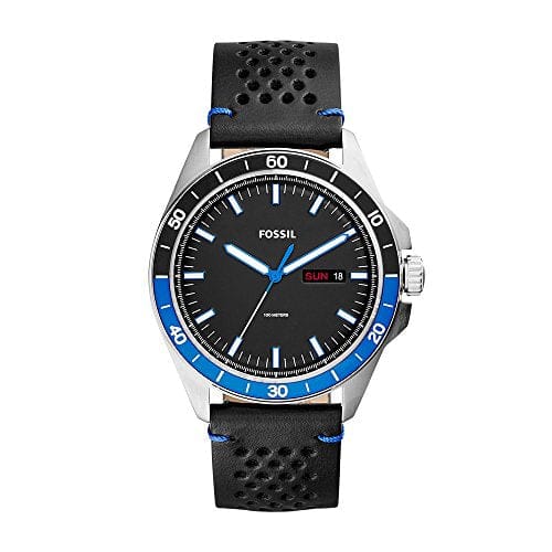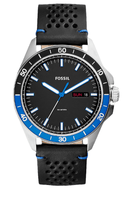 • FOSSIL men's watch - round case (diameter: 44 mm) stainless steel, brushed finish, waterproof 10 ATM, stainless steel bezel with blue and black aluminium insert