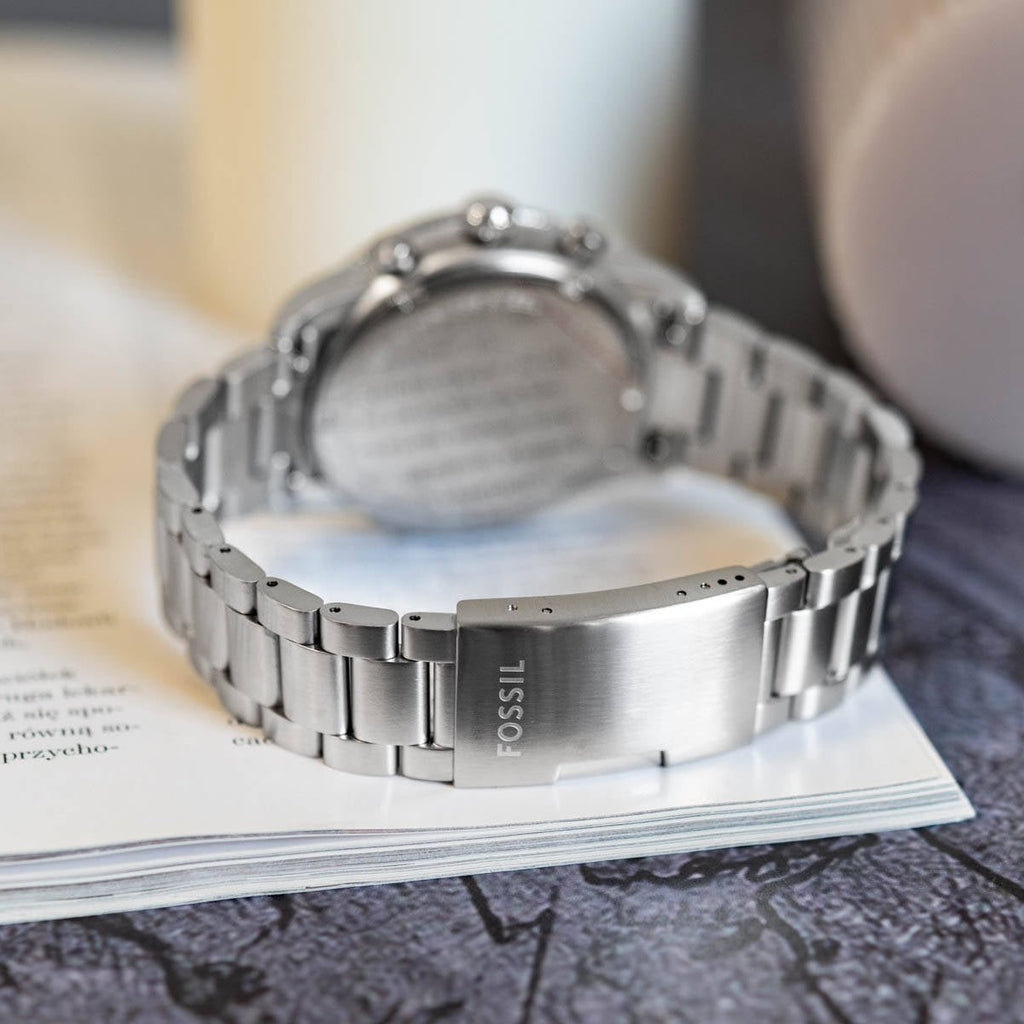 - Watch Band: Silver, durable stainless steel bracelet band with a secure fold-over clasp closure; links can be removed for a customized fit; interchangeable with all 22mm Fossil watch straps.