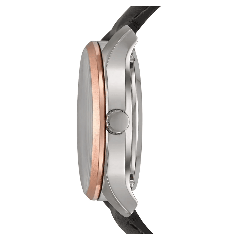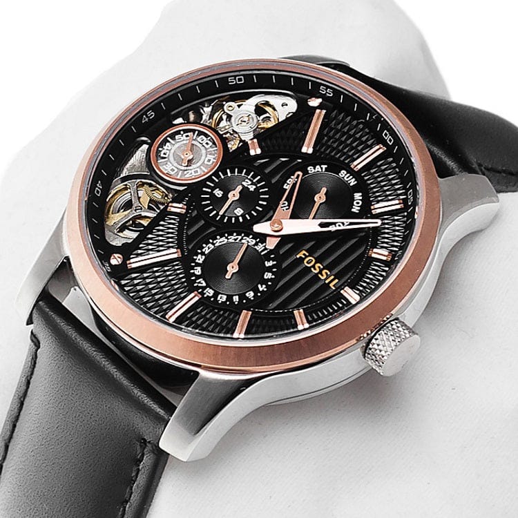 The rose gold-tone along with the black dial will give you an ultimate luxury and classy feel. The indices are also rose gold in colour. The right side of the watch that is black in colour is quartz controlled while the left side has twin movements i.e. a moving gear and a seconds hand that is automatic. And both the sides move independently and have no relation with each other. The look of the dial is really classy and wont let you take your eyes off it. The leather band plays a key role in lending it a royal look. It includes a day and date calendar. Like most Fossil watches it is also water resistant and can resist water upto a depth of 50 meters. So, gift yourself this beautiful creation by Fossil and take pleasure to flaunt it in style.