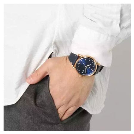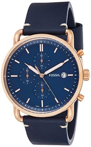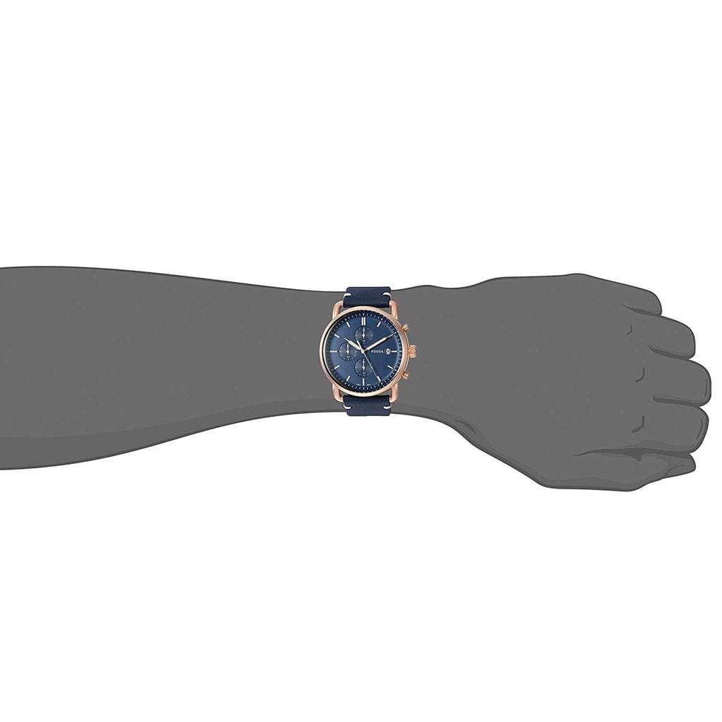Fossil FS-5404 Commuter Leather Strap Men’s Watch. The case is made out of rose gold stainless steel with a rose gold bezel, which stands for the high quality of the item, it has a blue Dial. This model has got 100 meters of water resistance. it can be worn in scenarios where it is likely to be splashed but not immersed in water and will be fine in rain. The watch is shipped with an original box and a guarantee from the manufacturer.